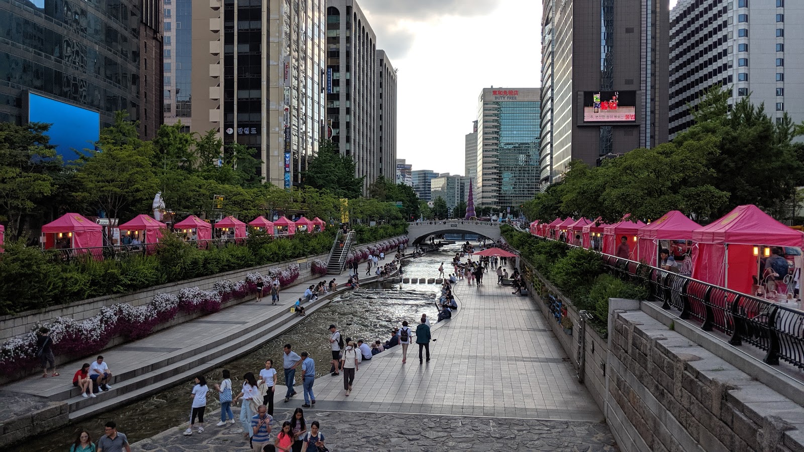 Cheonggyecheon, an urban greenway, for a run tomorrow. The original stream here was covered by a